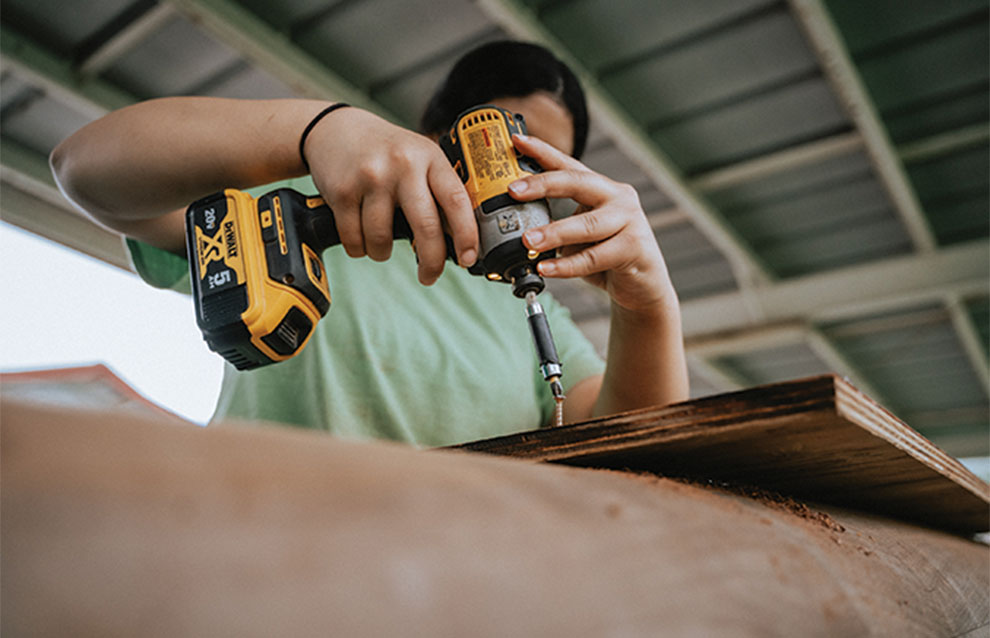 While Olivares encourages students to use traditional hand tools whenever possible, sometimes you just need a little extra power. Here, the first female HYCF student to work on the canoe removes a rotted section of wood.