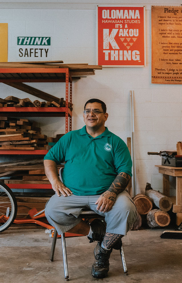 Since taking Olivares' courses, Makaio-Kalai says he's become interested in a career working with the aina, like gardening, farming or woodwork. "I love being around [Olivares] because it's learning about all the things I'm interested in, too, just all our traditions," he says. "He's kind of like me in a way: How we think the same, we're not always sure about something, but we'll get the task done. He's more like a father figure to me. A good influence."