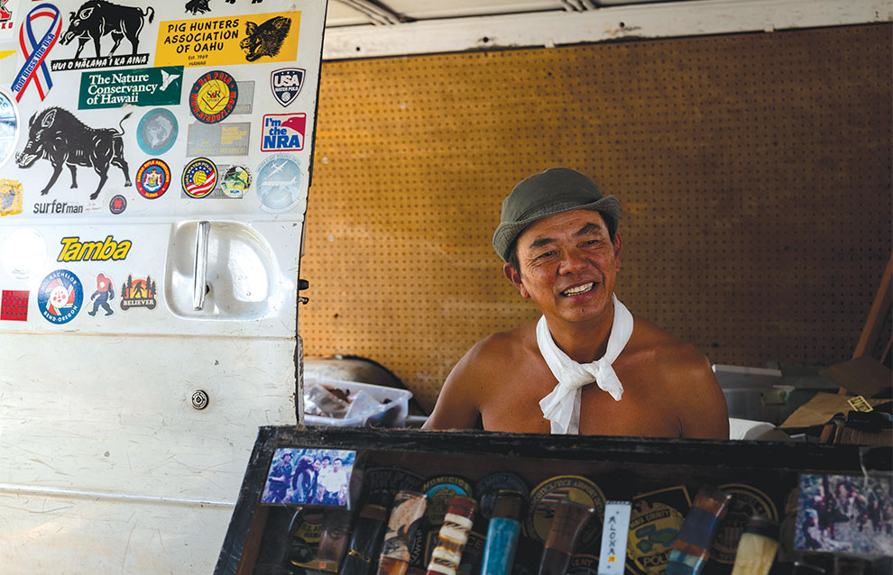 "This is one of the last strongholds for old-time people," Chin Ng says, shirtless and yet dapper in his bucket hat and a white handkerchief tied around his neck. He smiles behind rows of knives interspersed with photos of him and his wild boar kills-his stand seems incongruous among the pink plastic lei and plush Spam keychains being hawked around him. Ng is one of the swap meet's longest-running vendors, selling knives here for thirty-five years. "Not too much has changed," he says, in terms of shoppers, with "a good diverse mix of locals and military and tourists. But retail has changed-back in the heyday before the internet, [the parking lot] was all full of vendors." There aren't many sellers left who have been there as long as him, he says. "They are getting far and few, but there's always new entrepreneurs. That's what the swap meet is about." Or life. "Everything changes. The old regime is gone, and then the young blood comes in."
