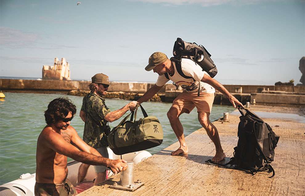 Smith (left) and fellow climber Jeff Johnson (right) debark at Temao on Makatea, which is accessible only by boat.