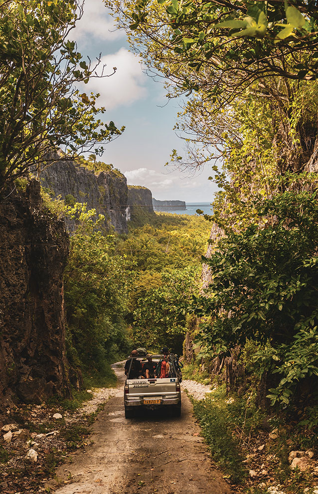 I make my way up the rock face trying not to look down and instead focus on the array of holds in the rock. I reach the top and James helps me up, guiding me into a shallow cave with a five-star view of the coastline while I wait for the others to ascend. When they do, we unclip and breathe it in. It’s magnificent, with birds soaring at eye level, flying in and out of valleys and narrow canyons. Heitapu appears and leads us around a portion of the cliff and through another cave to a prehistoric-looking gorge teeming with gargantuan palms and ferns. Makatea is one of the only atolls in French Polynesia with intact primary forest, and it’s home to some of the richest plant diversity in the archipelago. The island is home to seventy-seven native species, thirteen of them endemic to French Polynesia and four of them found only on Makatea.